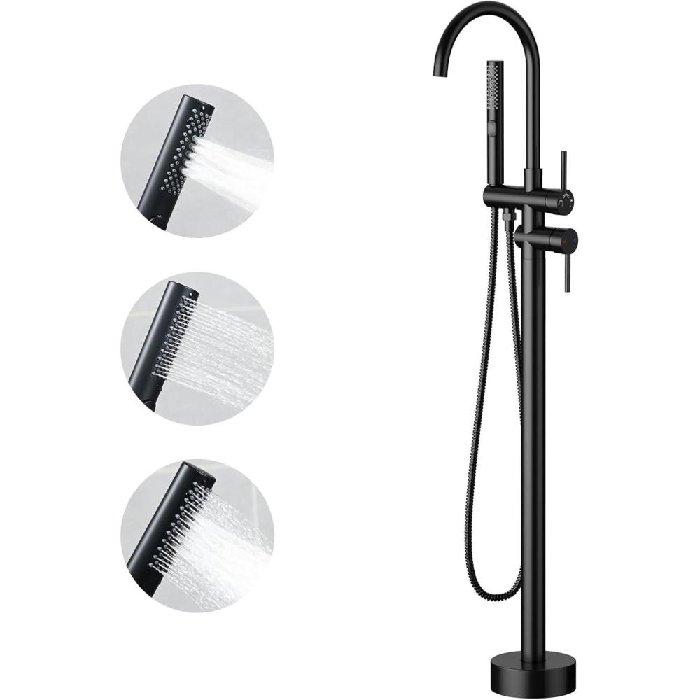 Free Standing Bathtub Faucet Set: SR SUN RISE Floor Mount Tub Filler with 3-Function Handheld Shower Head, Matte Black High Flow Brass Freestanding Shower Faucet(Matte Black)